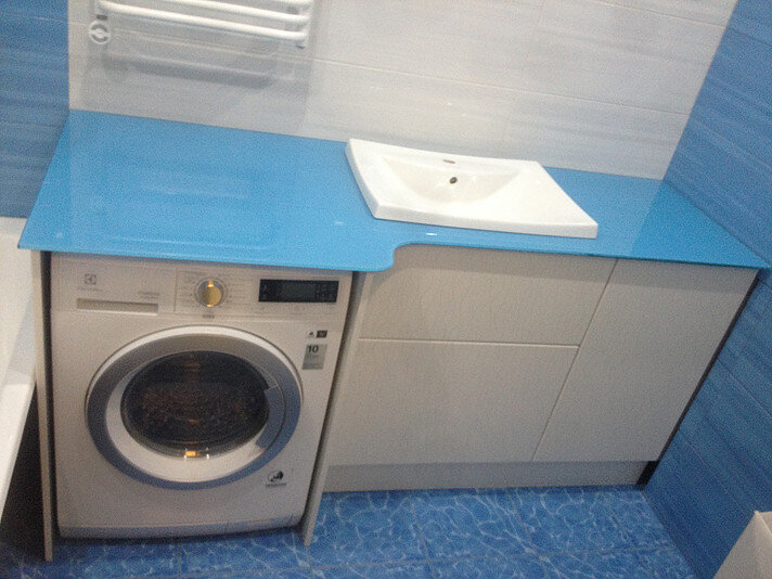Тумба для ванной комнаты со встроенной стиральной машинкой.