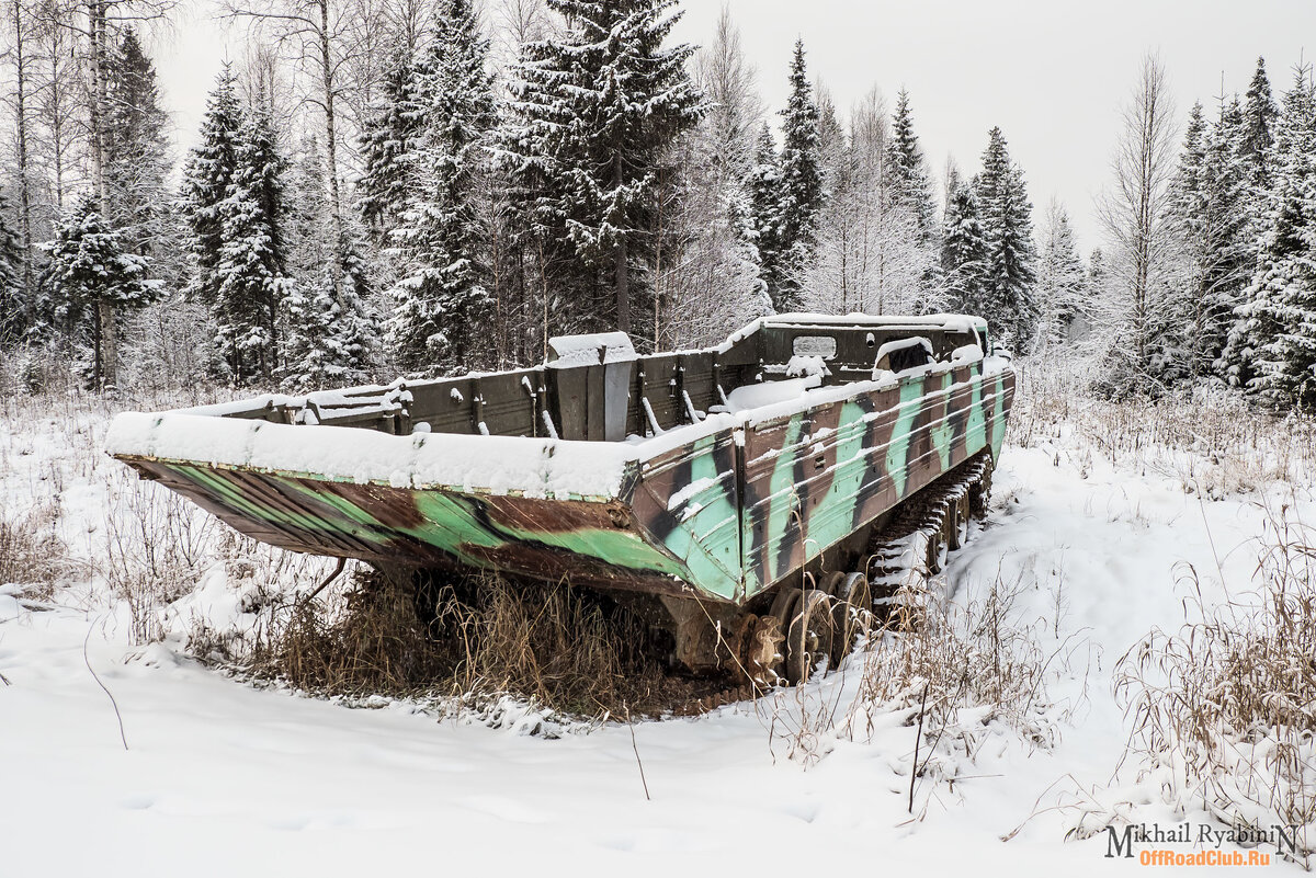 Я увидел его метров за 500. Снега выпало еще не очень много, но растительность здорово скрывала огромную тушу транспортера в камуфляжной окраске. Чем ближе подъезжали к нему, тем больше уважения внушали размеры брошенной в Тайге техники... Рядом с этой махиной наш Land Cruiser 76 выглядел малолитражкой, а до этого мы считали Круизер большим внедорожником плывущим по волнам бездорожья и заметенных снегом грунтовок. Исполин практически мертв и полуразобран. Вероятно он стоит здесь уже пару лет и возможно его периодически оживляют или делали это раньше. По крайней мере, проводка и основные узлы выглядят работоспособными. Транспортер ПТС стоит в направлении прорубленной просеки, уже медленно зарастающей. Скорее всего, в него грузили что-то типа Буханки и отправлялись в лес. В Буханке можно жить, а транспортер гарантировано вывезет потом назад. Была безумная мысль открыть задний борт и заехать в кузов на Тойоте для хорошего кадра, но кто-то уже снял трос с лебедки кузова, а вручную опустить