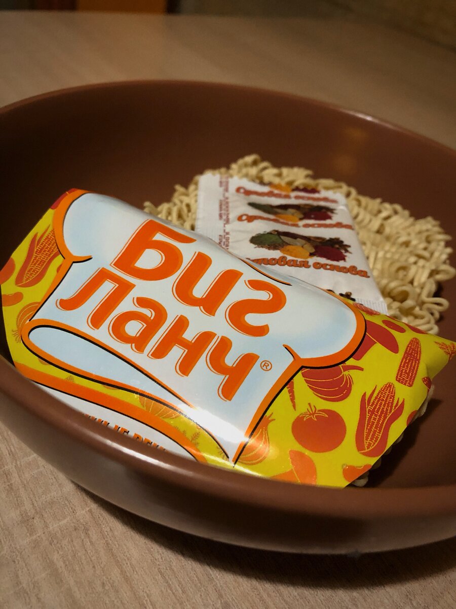 День 2. Биг ланч. Вечером второго дня было принято решение отпробовать Биг ланч. Я никогда не была фанатом данного БичПакета и по возможности старалась не брать его, видимо на то были свои причины. Но цель у меня одна - попробовать максимальное количество лапши и рассказать своё мнение, поэтому рука потянулась к пачке, и вот уже я вскрываю пакет и высыпаю содержимое в тарелку. Аромат приправы показался мне более токсичным, чем у Квисти, но отдалённо напоминал Роллтон. Я честно подождала 4 минутки, сняла крышку с тарелки и удивилась, макароны выглядели вполне себе аппетитно, аромат растворился в воздухе и обрёл приятные нотки настоящего куриного бульона. Лапша оказалась вполне вкусной, без навязчивого вкуса, плотной, сытной. Я удивилась, ведь я всегда считала Биг Ланч чем-то совсем никчемным и отвратительным, хотя сейчас я уже не вспомню почему, но данный момент это было очень даже вкусно, очень необычно, ведь действительно вкус был ближе к натуральному. Ах да, а как же послевкусие