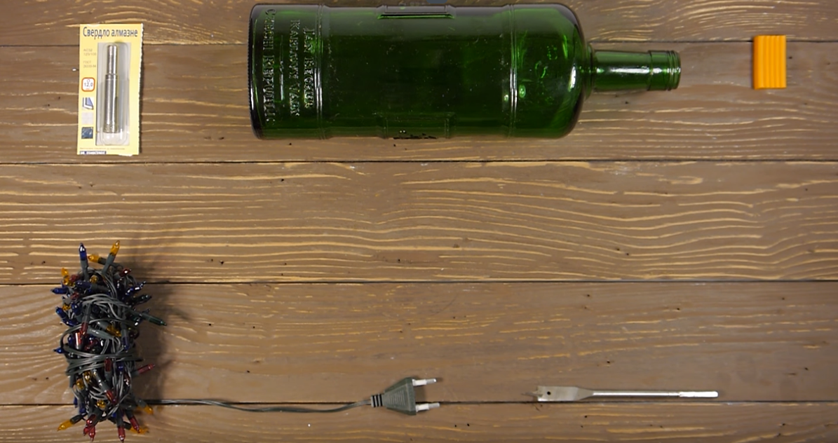 Добрый день строителям и дизайнерам! Сегодня займемся изготовлением довольно простой бородатой идеи по изготовлению новогоднего светильника из бутылки. Приступим. Нам понадобится бутылка (желательно зеленая), сверло, новогодняя гирлянда и пластилин. Начнем. Наш первый шаг будет самым тяжелым, приготовимся.