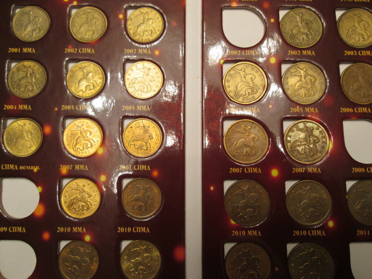 Ну вот, наконец-то дошла очередь до современных 10 и 50 копеек. Полный альбом с этими монетами обойдется 1200 рублей, но без редких монет, стоимость которых не указывается в ценниках. К таким редким монетам относятся 50 копеек 2001 года ММД, 10 копеек 2011 года СПМД, 50 копеек 2011 года СПМД, 10 копеек 2012 года СПМД и 50 копеек 2012 года СПМД. Впрочем все монеты 2011 и 2012 года СПМД являются редкими. К нечастым монетам относятся только 50 копеечные, среди 10 копеечных таких нет. 50 копеек 1999 года ММД стоят 50 рублей, у 50 копеек 1999 года СПМД цена дороже - 300 рублей; у 50 копеек 2002 года СПМД стоимость 150 рублей; у 50 копеек 2010 СПМД - 100 рублей. К сожалению эти нечастые монеты у меня отсутствую в альбоме, но я надеюсь, что когда-нибудь они мне попадутся. Например, вчера мужу на сдачу дали 2 рубля 1999 года ММД стоимостью 600 рублей, поэтому Вы тоже проверяйте свои кошельки. Нечастые монеты иногда попадаются. А самая радостная новость, то что у меня в воскресенье родился
