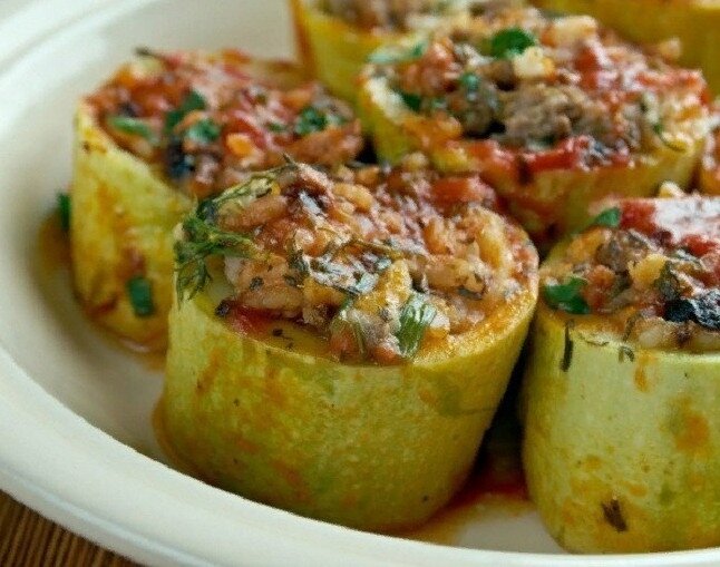 Фаршированные кабачки по-турецки Калорийность на 100 грамм - 73 ккал Белки - 4.7 г Жиры - 0.6 г Углеводы - 12 г Ингредиенты: Кабачки - 1 кг Бурый рис - 1 стакан Куриное филе - 250 г Помидор - 2 шт Лук - 1 шт Петрушка - 10 г Томатная паста - 2 ст. л Соль, перец - по вкусу ППриготовление: 1) Заранее замочить бурый рис в воде на ночь. Затем сварить до готовности в подсоленной воде. 2) Куриное филе перекрутить в фарш на мясорубке. 3) Кабачки помыть, разрезать на 3-4 части. Вынуть мякоть. 4) Порезать мелко лук и помидор, зелень порубить. 5) Куриный фарш смешать с рисом и овощами. Посолить, поперчить по вкусу и перемешать. 6) Нафаршировать кабачки и выложить в кастрюлю вертикально. 7) Томатную пасту смешать со стаканом воды и залить кабачки. Добавить кипяченой воды, чтобы кабачки были погружены в воду наполовину. 8) Готовить под крышкой на слабом огне в течение 30-35 минут после закипания воды. Приятного аппетита!