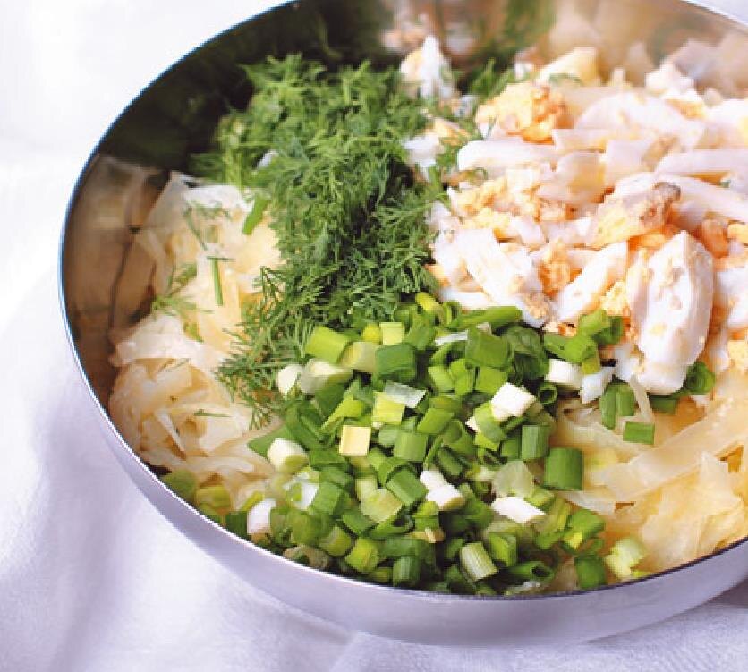 Для теста: 420 г (3 стакана) муки 2 яйца 50 г сливочного масла комнатной температуры 200 г сметаны жирностью 15–20% 1/2 ч. ложки соли Для начинки: 1/3 небольшого кочана капусты (около 300 г) 1 ст. ложка топленого масла 2 яйца 5–7 перьев зеленого лука 5–7 веточек зелени укропа 60 мл (1/4 стакана) молока 1 ч. ложка сахара Соль, молотый черный перец НЕОБХОДИМАЯ ПОСУДА И ИНСТРУМЕНТЫ: