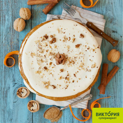 Масло сливочное 50 г. Способ приготовления Шаг 1 Отделить желтки от белков. Желтки взбить с сахаром до пышной пены и до растворения сахара. Далее по очереди добавлять ингредиенты в следующем порядке. Сначала в яичную смесь добавить морковь, тертую на мелкой терке. Затем добавить измельченные в миксере орехи, муку, разрыхлитель и цедру лимона. Перемешать до однородности. Шаг 2 Отдельно взбить белки до устойчивых пиков и осторожно перемешивая, ввести в тесто. Выложить тесто в смазанную маслом и присыпанную мукой форму (24 см). Выпекать в разогретой до 170 С духовке около 60 мин. Далее проверить готовность зубочисткой. Готовый бисквит остудить на решетке. Шаг 3 Для крема смешать ингредиенты (комнатной температуры!) и немного размешать, взбивая ложкой до увеличения массы в объеме. Кекс разрезать на 2 коржа, промазать кремом внутри, затем покрыть им весь торт сверху. Перед подачей украсить стружкой грецкого ореха. Оригинал статьи размещен здесь: https://clck.ru/EqCwX
