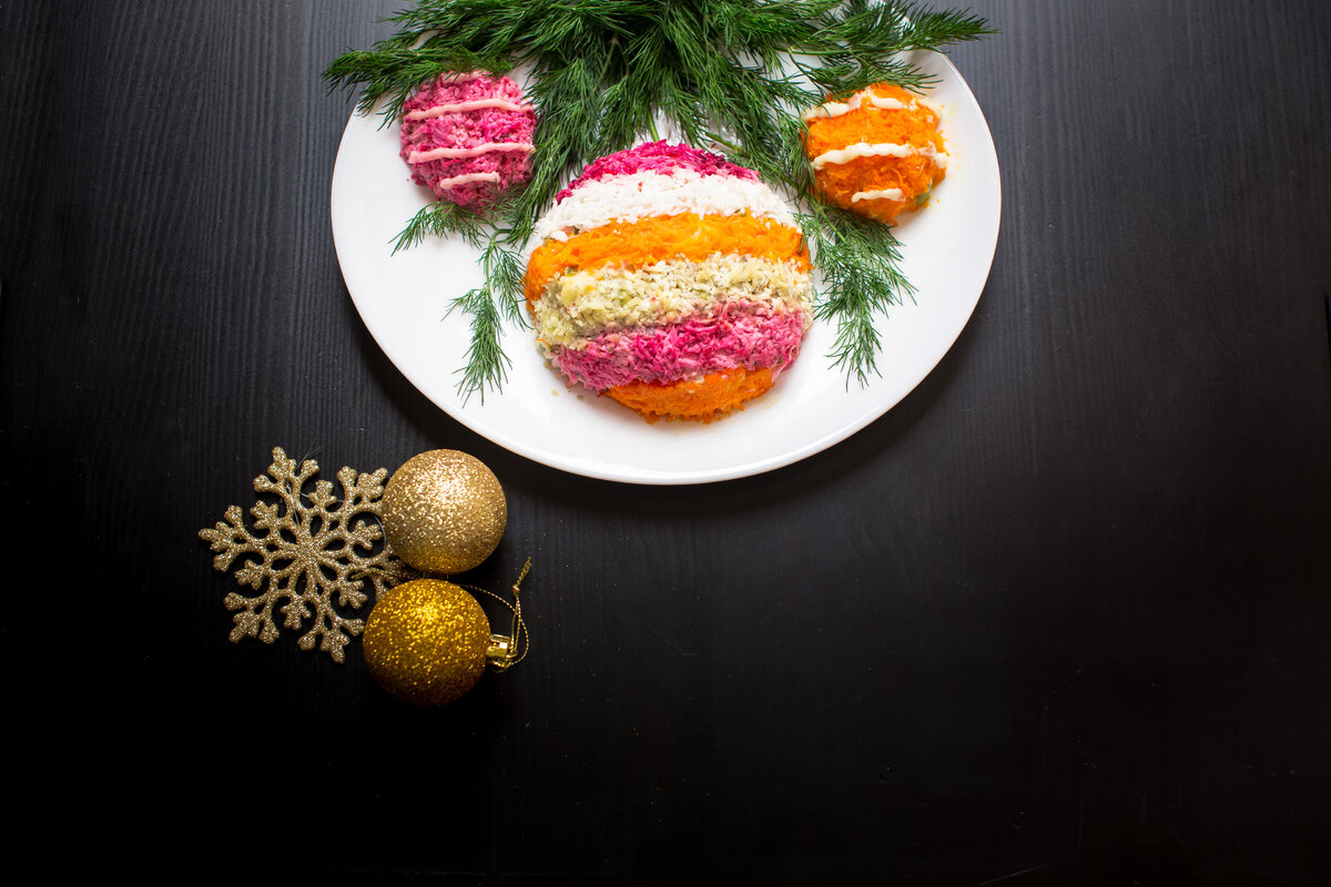 Поскольку уже наступил декабрь, пора придумывать украшения для новогоднего стола. Салат, выполненный в виде елочных игрушек, очень выигрышно смотрится на праздничном застолье. Сделать такое блюдо очень легко, а восторг гостей будет неописуем... Когда я делала свой сайт, подруга подарила мне фотосессию моих салатов - поэтому и на аватарке, и в этой статье профессиональные фотографии на нужном фотографу фоне. Черный фон не подходит для новогоднего стола, скатерть скорее всего окажется белой или цветной, поэтому не стоит использовать белую тарелку. Цвет тарелки должен контрастировать со скатертью. Салат для наших целей подойдет любой не слоеный, заправленный майонезом или сметаной. Еще он должен держать форму. На фотке - обычный оливье. Итак, на тарелку раскладываем кругленькими горочками разной величины салат и ложкой формируем полусферы с относительно ровной поверхностью. Затем насыпаем цветные полоски, сыплем аккуратно, чтобы слои не перемешивались. Разделить слои можно, выдавив сверх