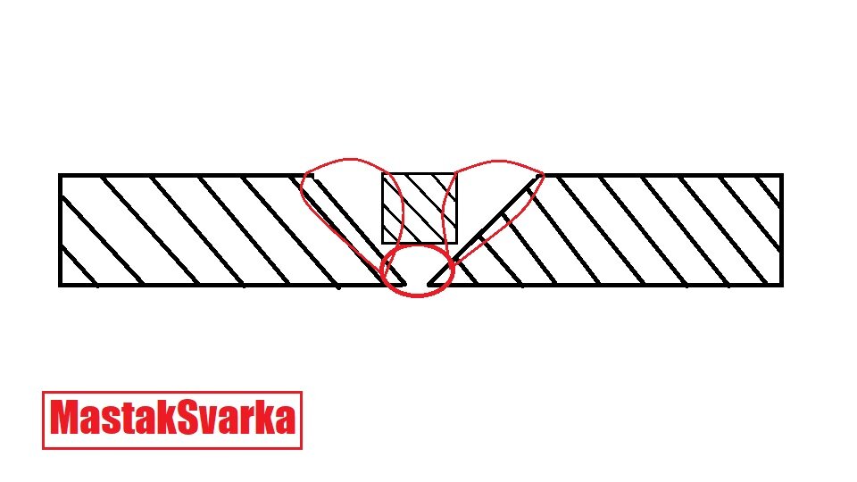Когда впервые увидел данную технологию сварки, то был очень удивлен и немного возмущен. Однако это официально существующая технология сварки толстого металла на не ответственных конструкциях. Технология заключается в следующем. Собирается стыковое соединение, отличие лишь в том, что угол скоса кромок увеличен до 45 град. Проваривается первый коренной проход, а за тем на получившуюся площадку укладывают закладную на всю протяженность стыкового соединения. Получившиеся дополнительные фаски заваривают таким образом, чтобы соединить сварные швы с корневым проходом. Данные соединения применяются ,например при сварке металлических полов в крупных производственных цехах, тем самым уменьшаются внутренние деформации в сварном шве. Но конечно самовольно использовать данную технологию запрещено, т.к. сварщик не может рассчитать нагрузку на узел.