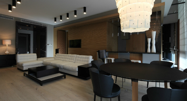 Апартаменты на берегу Москвы-реки площадью 120 кв.м решены в лучших традициях минимализма. Строгость форм и роскошь отделки гармонично дополняют друг друга в этом лаконичном мужском интерьере. Проект квартиры в новом жилом комплексе на берегу Москвы-реки от дизайнера Дмитрия Кулеша можно назвать образцовым примером эстетики минимализма. Естественная красота каждого из материалов, использованных в интерьере, раскрыта и подчеркнута. Пропорции всех предметов мебели выверены и отточены до совершенства, ничто не нарушает атмосферу покоя и созерцательного умиротворения. Именно таким автор изначально задумал это пространство, впервые увидев пейзаж, открывающийся из панорамных окон квартиры. В целом интерьер получился мужским, лаконичным и строгим, но вместе с тем воздушным и светлым. Отделка стен деревом в квартире и светлая паркетная доска на полу уравновешивают холодность каменных плит в облицовке холла и кухонного острова. Акцентом пространственной композиции гостиной-студии стал усеченн