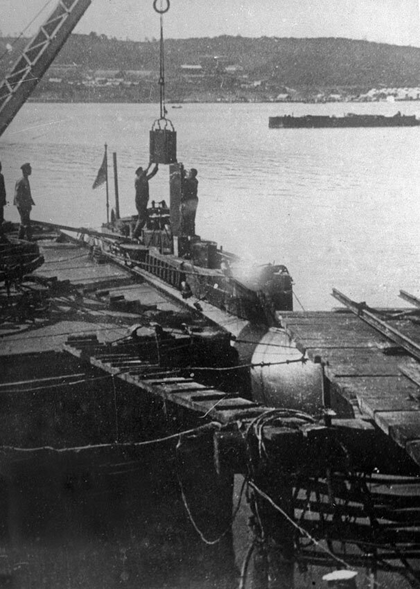 Погрузка аккумуляторов? Похоже и флаг георгиевский. Не знаю какая лодка на фото - лодками особо не занимался.
