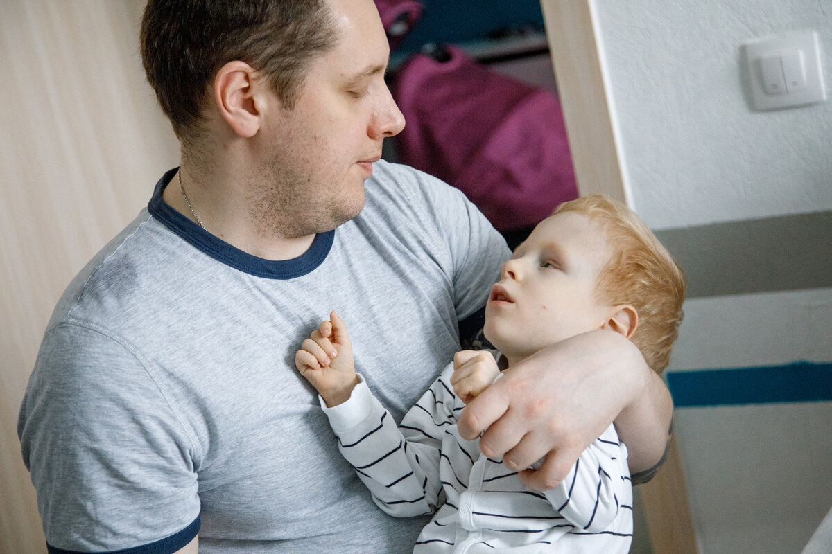 Саша всюду носит с собой сына: когда встречает нас, провожает на кухню, сидит за столом. Мишка похож на уставшую рыжую птичку: маленький мальчик с худыми руками и ногами прижимается к отцу. Но так только кажется: на самом деле это папа крепко прижимает его к себе – Миша не держит голову, не понимает, как потянуться к любимой игрушке. В свои три он не говорит, почти не двигается и не умеет управлять телом. У него видит только один глаз, и совсем нет слуха.