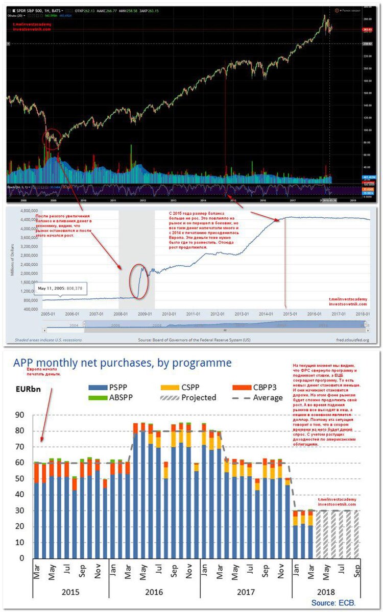 Ниже занятная зависимость роста американского рынка от количества напечатанных денег. Когда в 2014 ФРС свернула смягчение мы увидели боковик по рынку и даже первые попытки снижения рынка. Тогда то вспомните, как доллар начал крепнуть ко всем валютам. А ведь это только была репетиция. И ФРС решило выйти из ситуации попросив Марио Драги начать печатать. И вот к концу 2014 Европа запускает станок...и О ЧУДО! Рынок продолжает рост и мы начинаем обновлять исторические максимумы и все хорошо. Кризис миновал. Пока ситуацию спасли. А что мы видим сейчас? Рынок снова пытается снижаться, только вот печатный станок уже не исправит ситуацию. Будет ли расти доллар? Я думаю вы сами уже знаете ответ на этот вопрос.