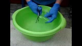 Берем обычные ножницы, наливаем в таз теплой воды, надеваем резиновые перчатки на руки, что бы не пораниться в случае чего, опускаем стекло в воду и начинаем резать стекло ножницами.