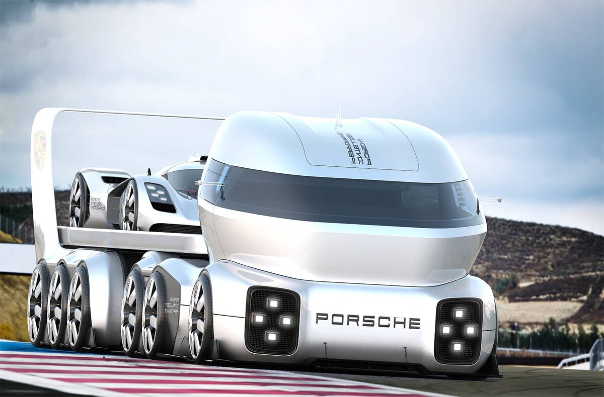 Дизайнер Александр Имнадзе известен своими смелыми работами на автомобильную тему. Только что он показал свой последний проект - грузовик Porsche GT Vision. Но это не просто грузовик, тысячи которых перевозят грузы по дорогам нашей планеты, а транспортер для придуманного им же пару лет назад гоночного автомобиля Porsche 906/917. Однако транспортировка гоночных автомобилей Ле-Мана - это не единственное, что может сделать грузовик GT Vision. Отцепив трейлер Porsche GT Vision превращается в гоночный грузовик! Очевидно, что этот продукт воображения Имнадзе не имеет никаких шансов стать реальностью. Но это ничего не значит, ведь это один из самых крутых дизайн-проектов на грузовую тему, что мы видели за последнее время. Он оснащен кабиной футуристического дизайна с обтекаемомым ветровым стеклом, камерами заднего вида и светодиодными фарами с изменяемой геометрией. Кабина намеренно выполнена чуть уже шасси, чтобы создать ощущение мускулистого внешнего вида. Сзади Porsche GT Vision оснащен ф