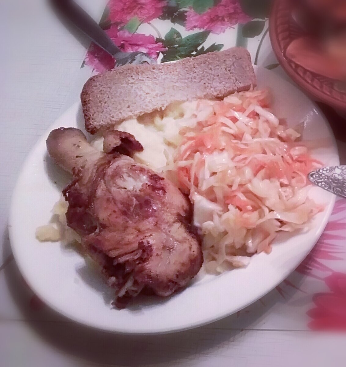 Начался первый день второй недели моего эксперимента. Его я встречала в полной боевой готовности, вооруженная багажом опыта накопленного за предшествующие дни, и новыми продуктами. Завтрак сегодня обещал быть прост и легок в приготовлении, но при этом питателен и полезен по своим свойствам. И этот факт, как вы понимаете, не мог меня не радовать. В сковородку с капустой я просто вбила яйцо из новой партии и все вместе подогрела. На плите это выглядело вот так. Вот знаете, я решила, что все-таки устрою вам сюрприз. Да-да, поем из сковороды. Хлеб и лимон я еще купить не успела, поэтому завтракала без хлеба, а чай пила без лимона. Но это меня нисколечко не огорчило. О закупке продуктов, как и обещала, написала отдельно. Позавтракав, достала из морозилки куриную ногу. Сегодня мне предстоял первый обед с мясом. Дальше отправилась по магазинам делать закупки на вторую неделю. За выходные купила не все. Вернувшись с едой, с радостью приступила к приготовлению обеда. Картошку почистила,