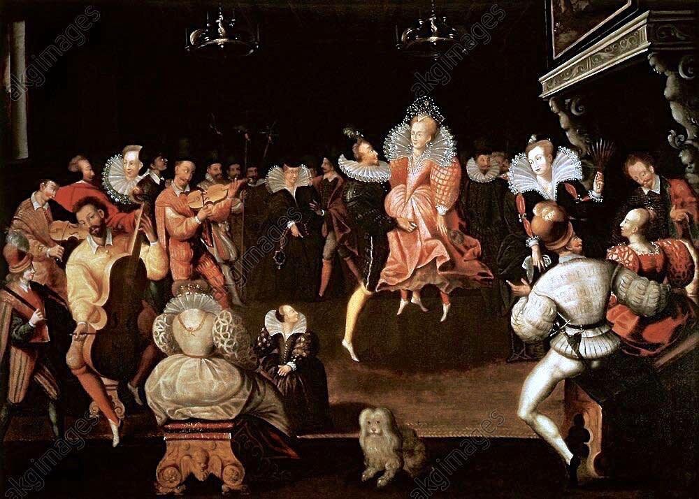 Сэр Джон Мэлвилл был поставлен королевой Елизаветой в неловкое положение: та спросила у шотландского посла, более ли она справедлива, чем его королева. Мэлвилл отвечал, что «Елизавета самая прекрасная королева в Англии, а Мария - самая прекрасная в Шотландии». Кто же из нас лучше танцует? - продолжила Елизавета. Во всяком случае королева Мария танцует не так высоко и свободно. Еще бы, учитывая болезность Марии Стюарт, постоянную мышечную слабость и нервные приступы, удивительно что ей вообще до танцев. Подобную коллизию некоторые источники приписывают и Венецианскому послу, может по ошибке, а может королева просто повторялась в своих причудах. На картине Елизавета исполняет Ла вольта со своим фаворитом Робертом Дадли в замке Пенсхерст.