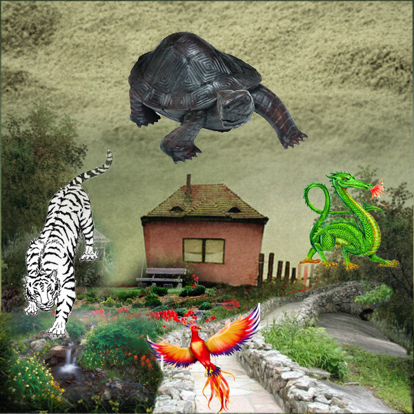 Считается, что дом с четырех сторон охраняется четырьмя животными-духами: Черной Черепахой, Красным Фениксом, Белым Тигром и Зеленым Драконом, о которых мы подробно говорим в курсе "Практический фэн-шуй". Эти животные символизируют четыре стороны света и четыре времени года. В фен-шуй им соответствуют четыре формы ландшафта, окружающего дом. Черная Черепаха - самый высокий участок местности, защищающий заднюю стену жилища от непогоды. Зеленый Дракон и Белый Тигр - также возвышенности, но более низкие; они расположены соответственно справа и слева от фасада. В идеале Дракон должен быть выше Тигра, чтобы Тигр находился как бы под его контролем. Красный Феникс - самый низкий из холмов, он находится перед домом и способствует тому, чтобы благотворная энергия ци извне гармонично сообщалась с ци внутри жилища. Такие же правила относятся к поселкам и целым городам, например, швейцарский город Монтрё расположен очень удачно с точки зрения четырех животных.