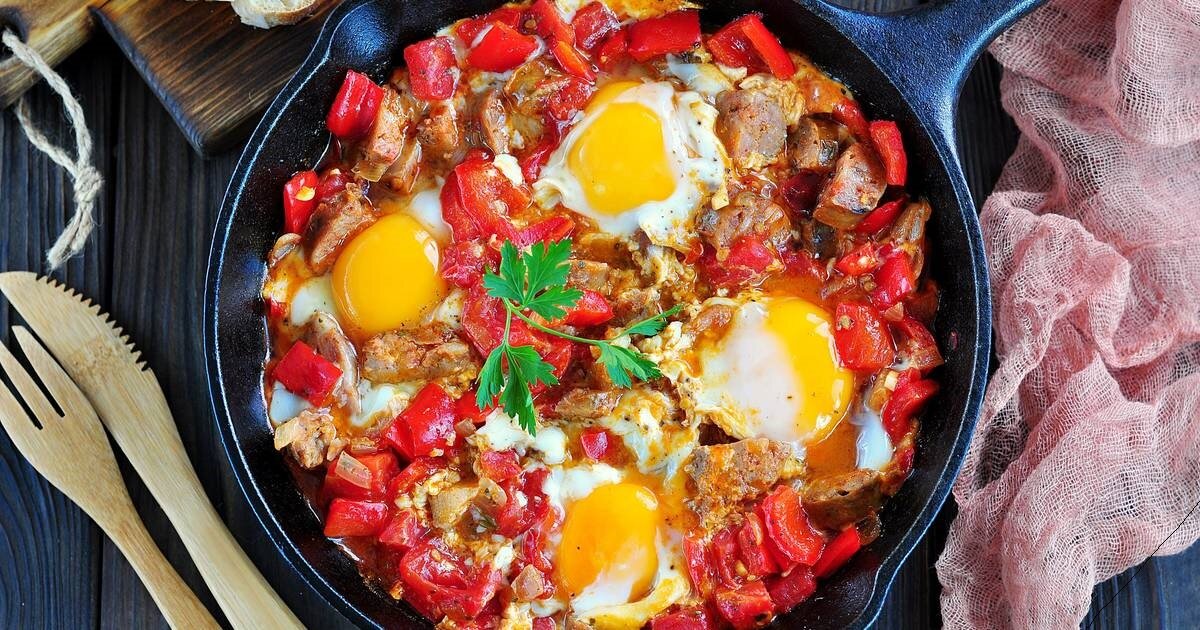 - Всё тушим на среднем огне, пока не выпарится лишняя влага, делаем в соусе углубления и аккуратно разбиваем туда яйца.