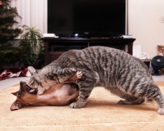 Кошка кидается в драку с собакой! Кто кого? Смотрим в видео!
