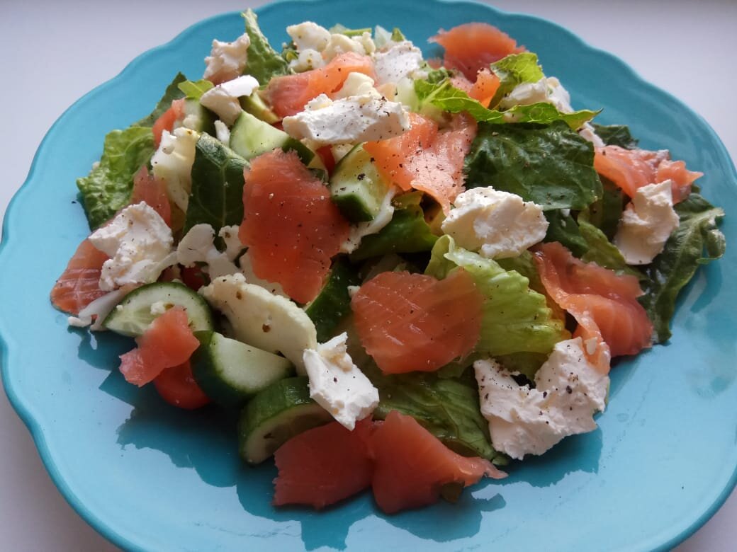 Ребята привет. В предверии праздников, невольно задумываешься о предстоящих посиделках и приготовлении различных новогодних явств. Поэтому буду немного писать и о новогодних блюдах. Конечно некоторые из них не будут простыми и майонезными, а немного сложноватыми, как может показаться на первый взгляд, но я Вас уверяю что- нет ничего более простого, чем сложное. Если Вам понравится рецепт, подписывайтесь на канал и ставьте лайки, это поможет нам развиваться. Всем спасибо! Так вот, начну с овощного салата с сёмгой и творожным сыром. Нам потребуется: -Семга слабосолёная 40гр -Сыр творожный 30гр -Салат листья 40гр -Огурец 60гр -Помидоры черри 7шт -Капуста цветная 30гр -Масло оливковое 20гр -Соль, перец по вкусу Итак для начала в глубокой миску нарываем зелёные листья, я беру салат айсберг или романо, так как он самый сочный. Но впринципе можно взять любой другой. Добавляем нарезанные огурцы, томаты черри режем пополам и так же кладём к салату, цветную капусту режем слайсами и закладываем