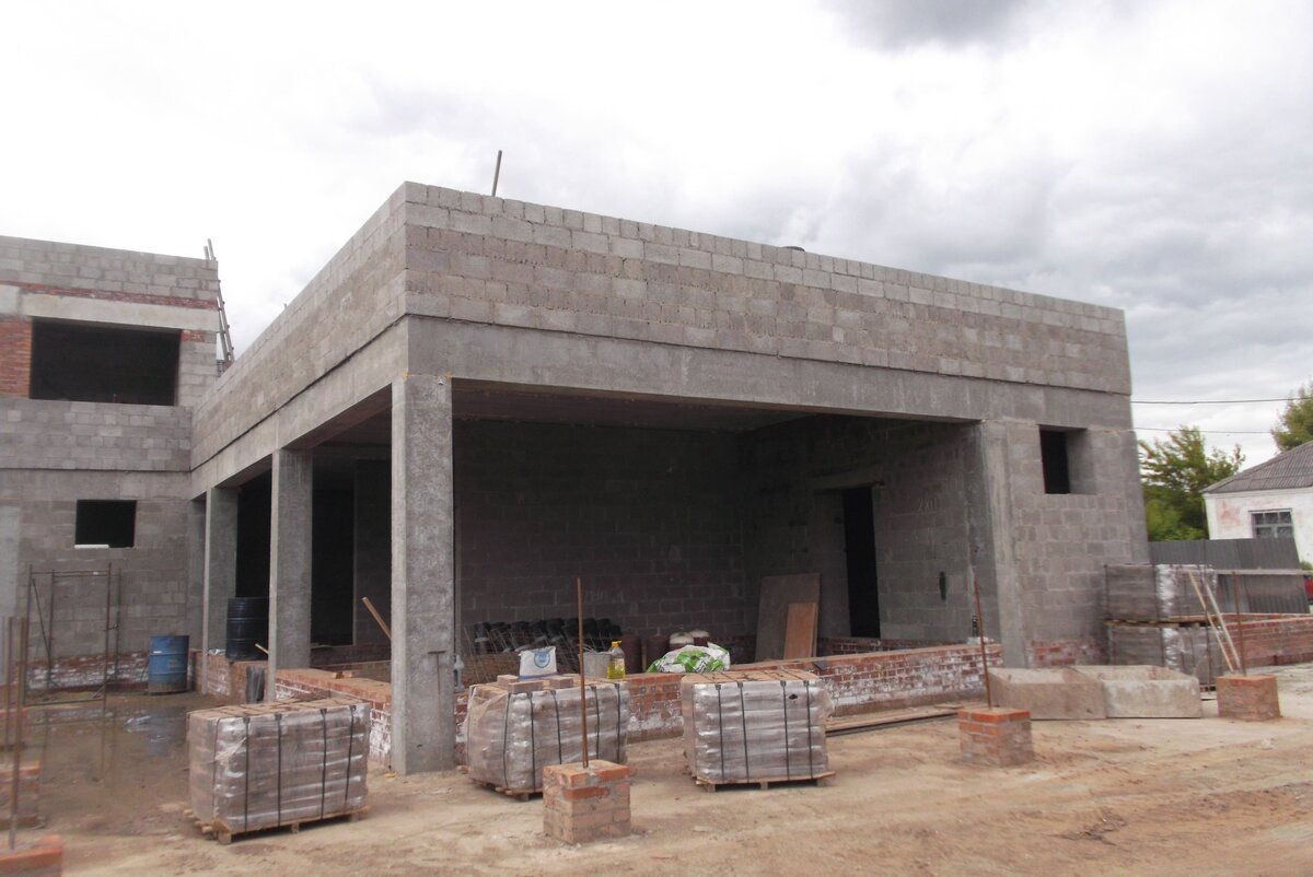 Всё начинается с этапа проектирования. От того, какой материал будет использован для стен и от местности зависит подбор фундамента, отделки. Наиболее разумным считается строительство дома из ячеистого материала (чаще это пенобетон). Это экономно с точки зрения монтажных работ и транспортировки. Ячеистые блоки обеспечивают высокую тепло- и звукоизоляцию, постоянство климата, надёжны, устойчивы к огню, экологичны. Стены После того, как на объект доставили блоки, нужно обеспечить их правильное хранение – блоки укладывают на специальные поддоны, укрывают водонепроницаемой плёнкой. Для кладки блоков применяются как клеевые составы, так и строительный раствор на основе цемента. Чтобы блоки легли максимально ровно, используют строительный уровень и шнур-причалку. Надёжность стен увеличивают, используя арматуру. Покрытие/перекрытие обычно выполняют из нескольких стандартных железобетонных плит. Если в доме предусмотрены довольно большие проёмы, поверху укладывают длинные балки. Место стыка д