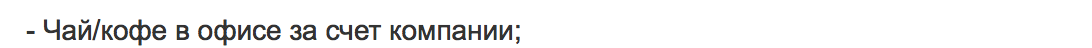 Кто-то расщедривается на печеньки. Со всей ответственностью заявляю, что это дурость — так писать. Когда нанимаете маркетологов, разработчиков или любого другого спеца из digital и пишете про чай и кофе, вы выглядите смешно и глупо. Во-первых, потому что люди устраиваются на работу, чтоб зарабатывать деньги, а вы им про чай (как будто предложить больше нечего). Во-вторых, во всех приличных компаниях чайкофепеченьки всегда есть (ну вы еще про кулер с водой расскажите). В-третьих, вы лучше зарплату предлагайте адекватную — а чай человек себе сам купит. И кофе тоже. Будьте умничками, не видите себя, как идиоты, и не пишите так. Никто не приходит работать за воду и еду. В наше время этого не делают даже студенты. 😌