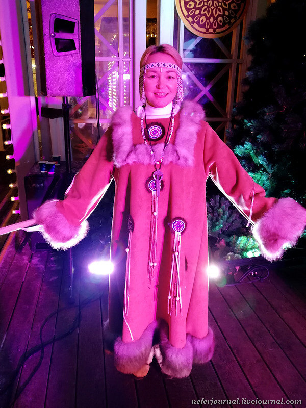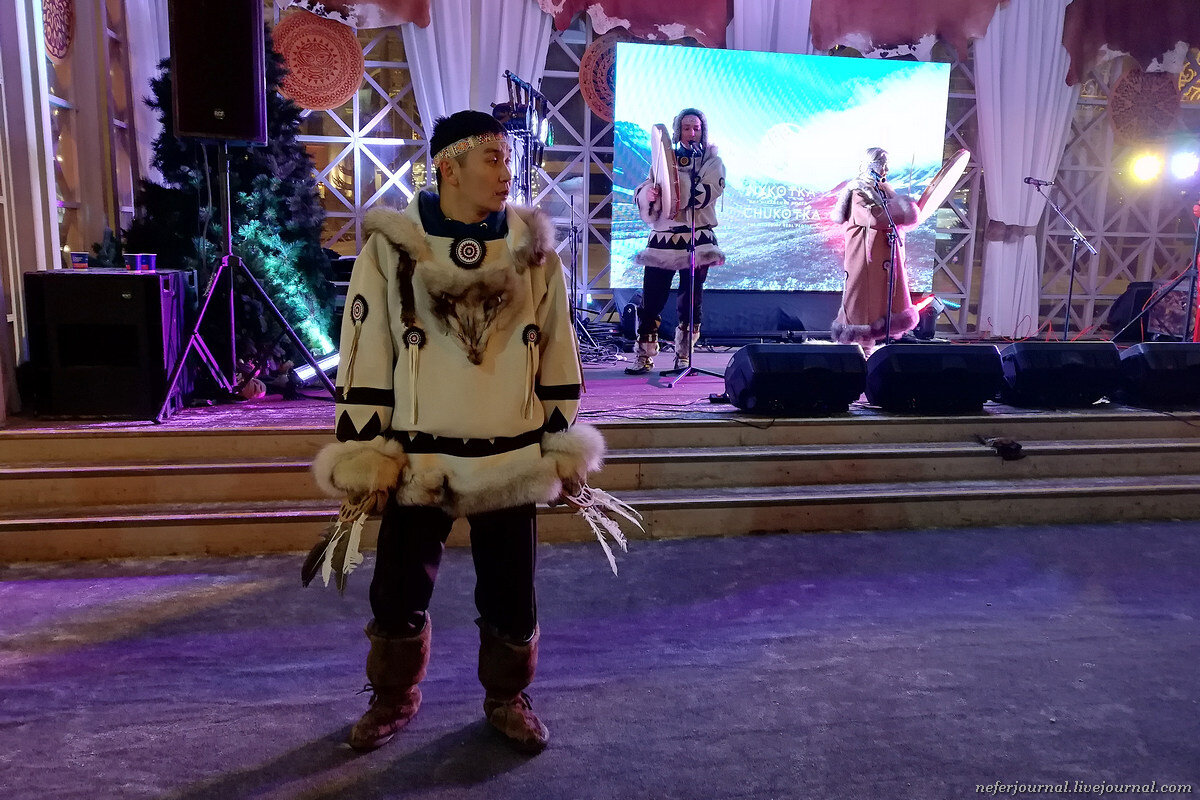 Вот нарезка вчерашнего выступления. Чукотские танцы под звуки бубна. Они повествуют об охоте и рыбалке. Движения нередко повторяют повадки птиц и животных.