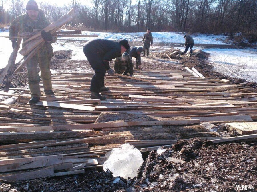 Жители сел Измайлиха и Метеоритный Красноармейского района своими силами начали строить проезд через реку Маревка, где еще в июне обрушился деревянный мост. Временная переправа до сих пор здесь не появилась, а людям по-прежнему приходится выбираться в ближайший город – Дальнереченск – по остаткам моста. Последние две недели у реки Маревка кипит работа. Мужчины в теплых ватных костюмах и резиновых сапогах отсыпают на схватившемся льду грунт, укладывают доски, подливают воду, чтобы лед был толще. Только вот строит переправу не подрядчик, а сами местные жители. «Шесть месяцев мы отрезаны от города, и всем на нас наплевать. В итоге наши мужики отчаялись, потому что ждать нам помощи не от кого, и пошли сами делать временную переправу через речку. С утра до вечера они занимаются этой переправой. Последние два дня были дожди и оттепель, испортили им работу, сейчас мы ждем снова морозов, чтобы продолжить строительство. Надеемся, что до конца декабря у нас появится проезд через речку», – рас