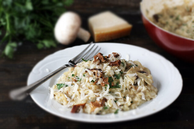 Грибное ризотто - это то блюдо, которое идеально подходит для тех дней, когда вам нужно что-то, ароматное, простое в приготовлении, которое можно подавать сразу, после приготовления. Самое главное при создании ризотто, чтобы каждый ингредиент был приготовлен заранее, перед началом приготовления, так как приготовление ризотто включает в себя постоянное перемешивание. Ингредиенты: Инструкция приготовления: 1. Замочите белые грибы в горячей воде на 10 минут и слейте воду. Нарежьте ломтиками и отложите. 2. В кастрюле нагрейте масло на среднем огне. Лук и чеснок варить около 5 минут до мягкости. 3. Добавьте нарезанные ломтиками грибов и продолжайте варить еще 4-5 минут до размягчения. 4. Добавьте рис и обжаривайте еще 2 минуты, постоянно помешивая. Добавьте белое вино и дайте ему испариться при перемешивании. 5. Добавьте половник овощного бульона, перемешайте до полного впитывания жидкости. Продолжайте добавлять бульон постепенно, пока жидкость не впитается и рис не станет сливочным и нежны