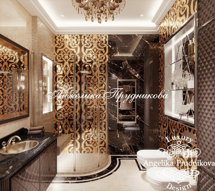 Оттенки темного шоколада и капучино в отделке, много золота и света, тонированный хрусталь и мозаичные панно ручной работы – дизайн-проект интерьера ванной комнаты в коттедже в Брянске поражает обилием оригинальных декораторских идей. Здесь царит неповторимая атмосфера роскоши, которую поддерживают все элементы обстановки.