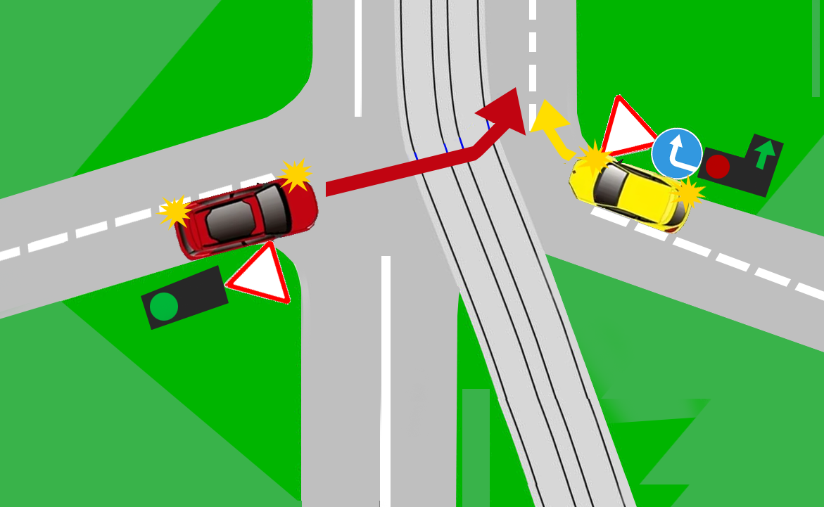Два водителя опять не могут поделить дорогу и им нужно разобраться, как правильно поступить на перекрестке, чтобы проехать его без последствий. Итак, красная машина приближается слева, желтая справа. Вопрос в том, кто имеет право проехать первым, а кому придется подождать.