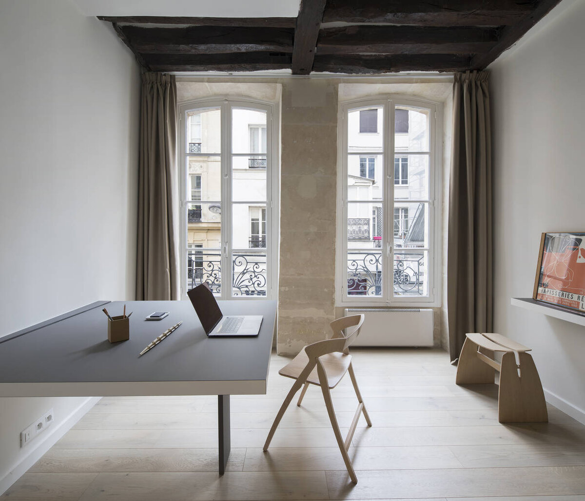 Дизайнеры EDB STUDIO уместили в старом парижском доме огромный функционал. Для этого оказалось достаточно окружить санузел шкафами- трансформерами и привесить стол на стену. Проект создали на контрасте исторического дома и современной обстановки. Для этого восстановили старые потолочные балки и зачистили стену с окнами до известняка, из которого построено здание. Небольшое помещение разделили на санузел и гостиную. В обычном состоянии из мебели здесь только пара табуретов. Зато картина на стене легко раскладывается в огромный обеденный стол. Он же необходим владельцам студии и для работы. Но порой бывает быстрее и проще разложить маленький столик, который встроили в стену. За ним можно поработать или сервировать обед для одного. А на время вечеринок он же превращается в чайную или мини-бар. Функционал кухни перенесли в коридор-прихожую. Гарнитур встроили в стену рядом с обычными шкафами. Компактная зона готовки включает мойку и варочную поверхность на пару конфорок, а также мин