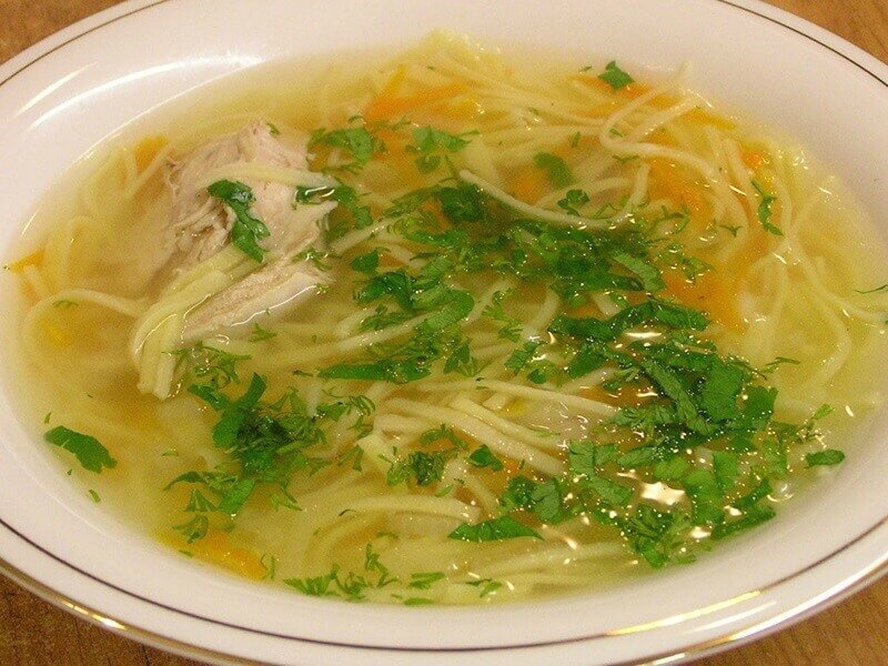 Существует множество супов с курицей, однако важнее всего правильно сварить бульон. В него можно добавлять любые продукты, получая каждый раз новое первое блюдо. Самый распространенный рецепт – это куриный суп с лапшой, речь о котором и пойдет дальше. Куриный бульон Выбирать лучше немолодую несушку, причем использовать рекомендуется целую курицу. Если нет такой возможности, то подойдет суповой набор. Кроме мяса, для бульона потребуется лук и морковь целиком, различные приправы. Курицу промывают, заливают прохладной водой и ставят вариться. Для получения прозрачного бульона соль добавляют в конце. Луковицу и морковь почистить, разрезать пополам и отправить в кастрюлю. Варить около 1 часа до готовности, снимая пенку. Из готового бульона достать овощи и курицу, мясо можно оставить для другого блюда или порезать и вернуть в суп. Желательно процедить бульон, чтобы он был прозрачным. Простой рецепт куриного супа с лапшой Первое получается очень вкусным и сытным, так как используется яичная