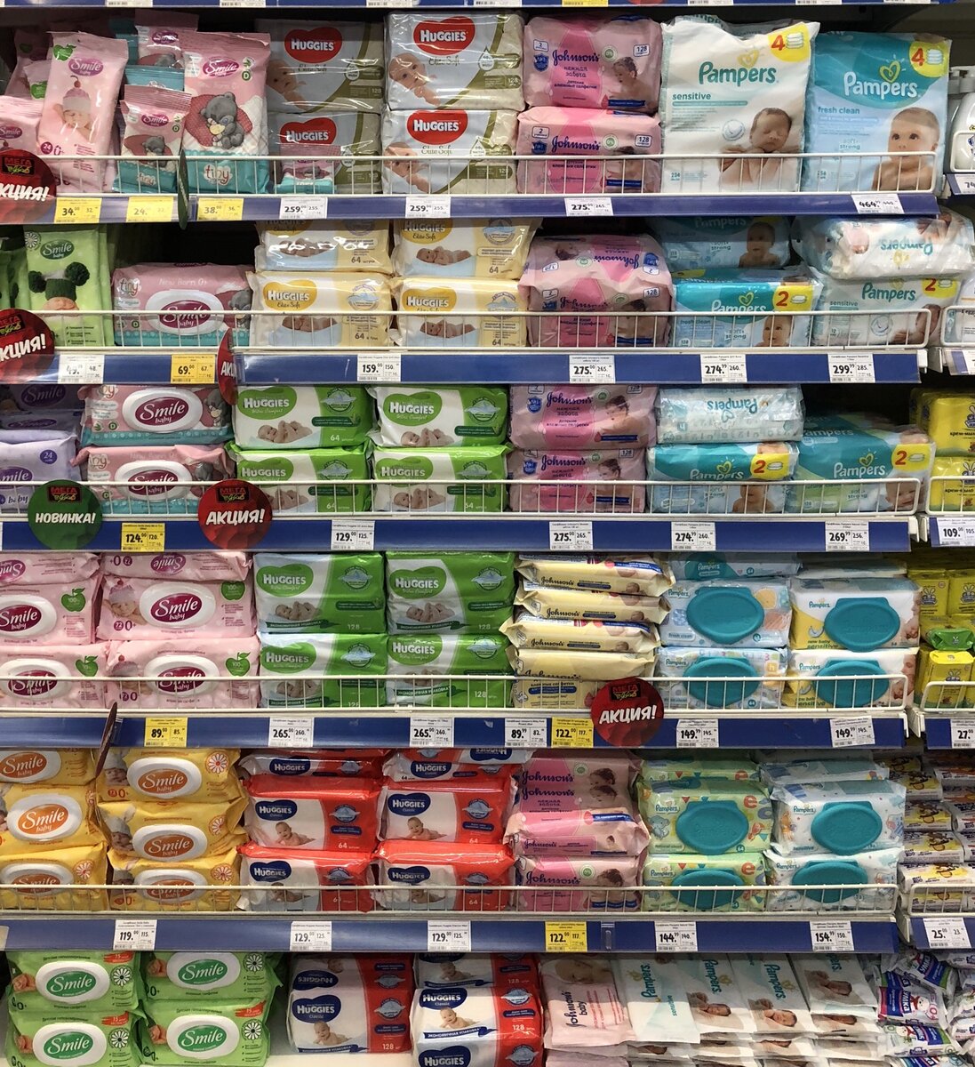 В общей сложности я перепробовала более 10 различных видов салфеток (обзор сделаю только на популярные марки) . И знаете, я поняла, что ориентироваться на цену в этом вопросе не стоит. В этом обзоре я подробно расскажу о своем опыте использования и постараюсь подсчитать выгоду. Для чистоты эксперимента рассмотрим упаковку по 64 салфетки, цены возьмем из магазина АШАН, а количество смен памперса приравняем к 4. Итак начнем.