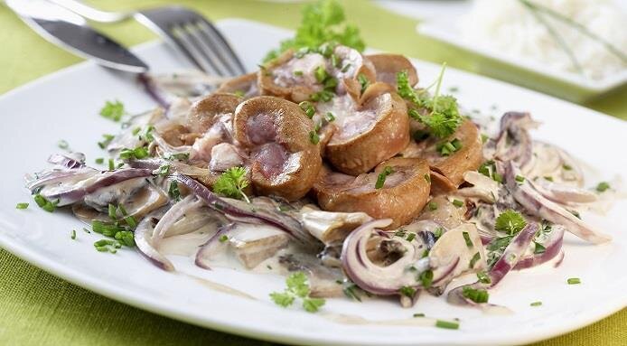 Самые вкусные почки - телячьи. Их достаточно просто ошпарить кипятком перед приготовлением. Бараньи, свиные и говяжьи почки, перед тем как начать готовить, необходимо замочить в холодной воде на час, слить воду, положить в кастрюлю и довести до кипения, а затем опять промыть холодной водой для того, чтобы отбить неприятный запах. Подготовленные таким образом почки станут практически не отличимы по вкусу от телячьих. Что можно приготовить из почек? Самое быстрое и легкое - почки в сметане и жареные почки. Это рядовые будничные рецепты на каждый день. Немного сложнее, но значительно вкуснее почки с ветчиной и грибами; будут уместны даже на праздничном столе. К почкам подают сухое красное вино. Почки в соусе с ветчиной и грибами Для этого блюда берем на 200 г почек 100 г ветчины, 100 г шампиньонов, одну небольшую луковицу и по 50 г сыра и сметаны. Почки нарезать в форме куриной лапши, причем телячьи - сырыми, говяжьи - вареными. Так же нарезать ветчину и шампиньоны. Обжарить на сковород
