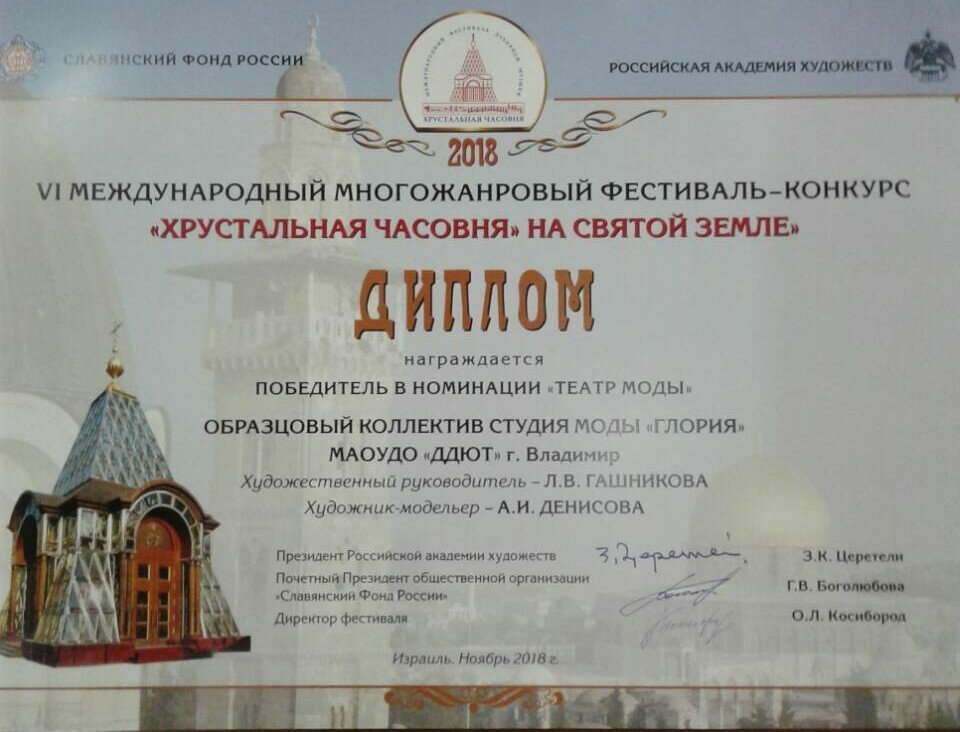 Юные кутюрье студии моды «Глория» владимирского Дворца детского и юношеского творчества вернулись с дипломом победителей в своей номинации из Израиля. Рукодельницы и модницы из образцового творческого коллектива с успехом выступили на VI Международном фестивале «Хрустальная часовня на Святой земле».