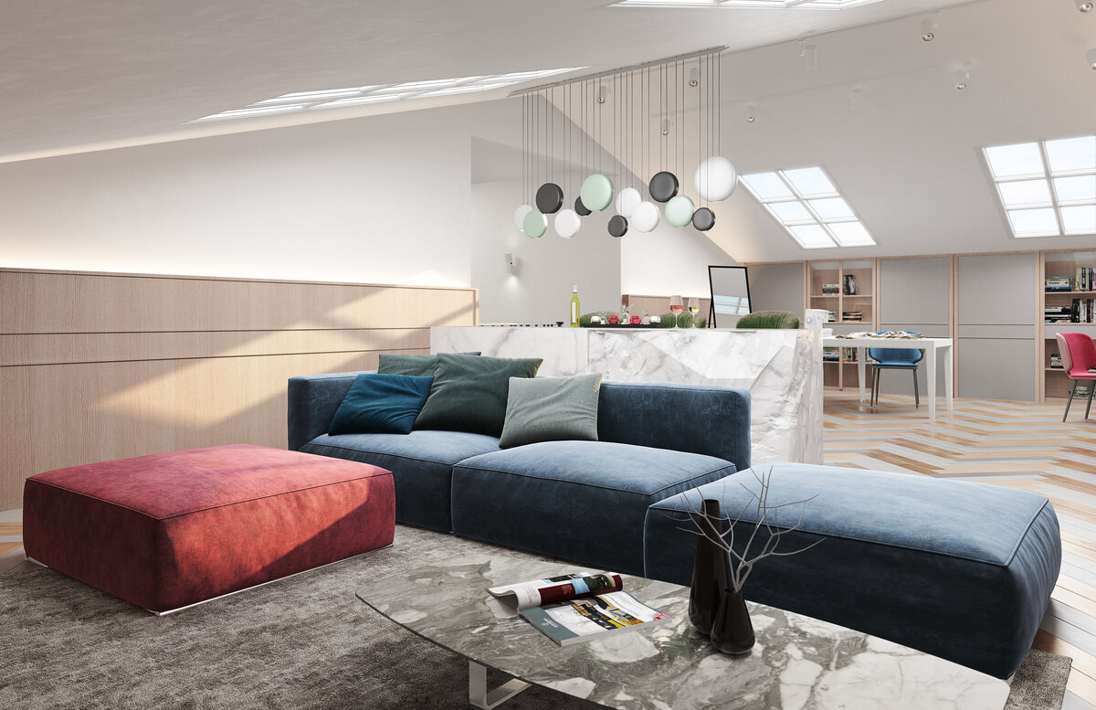 Друзья, заглянем еще в одно помещение нашего загородного дома. На 3 этаже загородного дома находится мансарда, помещение которой мы грамотно организовали. Зона бара представлена маленьким холодильником, барной стойкой из цельного куска мрамора, стульев и светильников. Многие элементы интерьера нам уже знакомы: светильники из той же серии, как и в столовой зоне, мрамор, украшающий фартук кухни и камин на первом этаже. На мансарде предусмотрена рабочая зона, так как наша клиентка занимается пошивом одежды. Здесь мы организовали мастерскую с большим столом для кройки, зеркалом в полный рост для примерок, шкафами вдоль стен для журналов мод, выкроек, лекал и т.д. И обязательные атрибуты мастерской — швейная машинка и манекен. Большой простор для творчества хозяйке дома, мы думаем, будет обеспечен. Еще одна зона — зона для отдыха. Стены облицованы деревянными панелями такими же, как в санузле в гардеробной комнате. Диван пыльно- синего и бордового цвета, на котором можно комфортно р