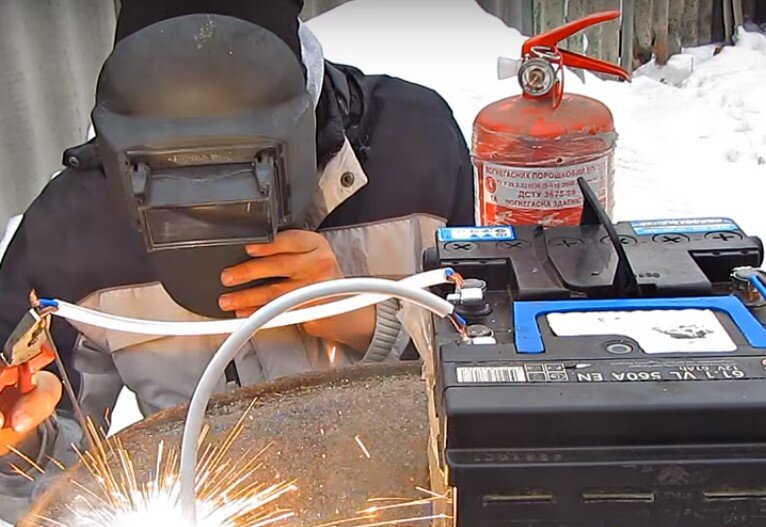 Всех приветствую . Продолжаем наш сварочный дневник . И сегодня я хочу рассказать Вам о таком необычном способе сварки , как сварка от автомобильных аккумуляторных батарей . Звучит довольно необычно и неправдоподобно , но такой способ сварки существует и довольно успешно применяется в экстремальных ситуациях . Где и когда люди впервые додумались до этого точно не известно , но первый официально задокументированный случай сварки от аккумулятора был сделан в 60 х годах прошлого века . Этими смелыми ребятами были наши советские полярники - исследователи . Видимо хорошо шарили в электрике , да и деваться было некуда , вот и стали варить ! Этим способом довольно часто пользуются дальнобойщики и путешественники джиперы . Ведь где они ломаются , никакой сварки не бывает , вот и выходят из ситуации с помощью аккумуляторов . Так как же произвести эту сварку ? Характеристики аккумулятора вполне позволяют это делать , ведь стандартный аккумулятор легковушки 55-60 ач способен в течение целого часа