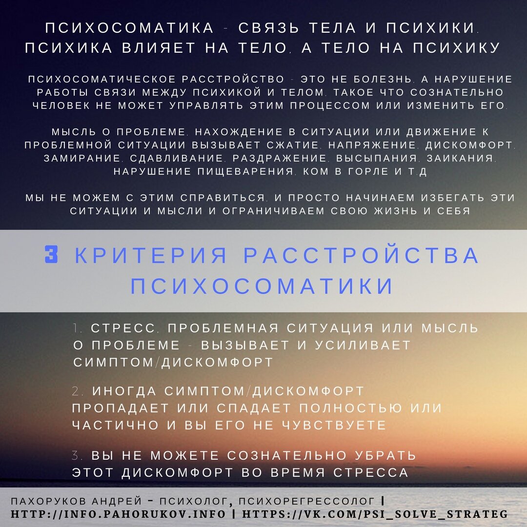 Существует много мифов и мнений про то, что такое психосоматика. Но на деле все проще, если знать суть и как с этим работать и что делать. Сохраните себе на стене или в телефоне, чтоб знать, что можно легко в жизни поменять и жить более счастливо. Психосоматику легко проработать, и сразу после сеанса вы сможете проверить изменения объективно. Например, только что закончил диагностику девушки, которая хотела пойти заниматься фитнесом, купила абонемент, но так и стала заниматься. И теперь даже мысль о том, что на пойдет на занятия в спортзал вызывает сжатие в животе и сжатие в горле и все это сопровождается чувством стыда и самоопределением что она «Жалкая». Обычно все это прорабатываем за одно занятие и после этого клиент сразу идет и делает, то что не мог и больше не тратит силы на сдерживание себя, а получает кайф и удовольствие от процесса и результата. Иногда это похоже на чудо. Ссылка на сайт