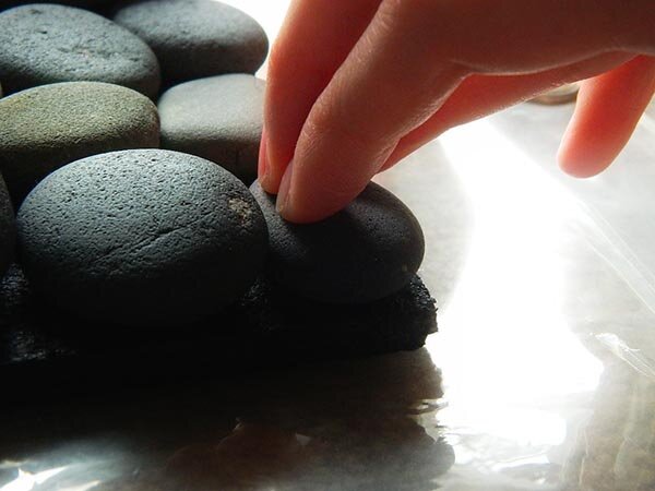 Для изготовления возьмите любой резиновый коврик и наклейте гладкую гальку прозрачным клеем. Камушк