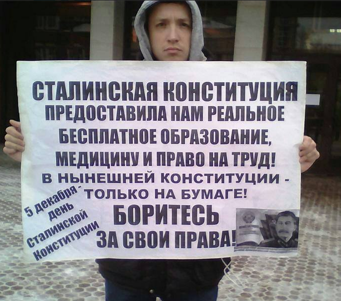 В Саратове молодой человек пикетировал думу с плакатом «Сталинская Конституция предоставила нам реальное бесплатное образование, медицину и право на труд! В нынешней Конституции – только на бумаге! 5 декабря – день сталинской Конституции. Боритесь за свои права!» Журналисты спросили у активиста, стали бы при Сталине запрещать концерты модных групп, как это произошло накануне с коллективом IC3PEAK. По мнению пикетчика, при «отце народов», как минимум, не стали бы переписывать личные данные пришедших на концерт, потому что сталинская Конституция защищала личную информацию. Предполагаем, что юноша прав. Зачем переписывать личные данные, если можно просто расстрэлять. Подписывайтесь на нас в "Дзене"!
