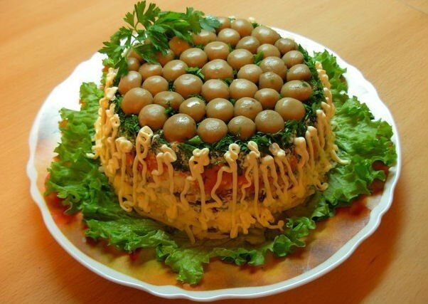 Это потрясающий салат и снаружи и внутри. Очень красиво смотрится на столе, просто и легко готовится, к тому же невероятно вкусный. Салат "Грибная поляна". Ингредиенты: ● Отварное куриное филе или ветчина из индейки 300 г
