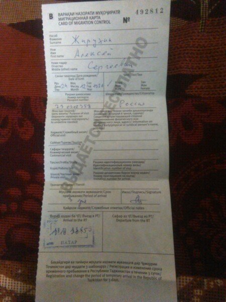 На таджикской стороне никого не было, только один таможенник плохо разговаривающий по-русски. Он показал, что нужно заполнить новые миграционки, на обратной стороне которых пестрела реклама Мегафона "Надежная связь великой страны". Никогда не думал, что "великая страна" зарабатывает на рекламе коммерческих компаний на миграционных листах. В Таджикистане как и в Узбекистане можно находиться только 3 дня без регистрации. Далее мы спросили, как добраться в Худжанд - ближайший крупный город севера Таджикистана. Он сказал, что ехать около 100 км и только на такси, а таксистов в это время уже нет, но он может вызвать кого-нибудь, что собственно и сделал.