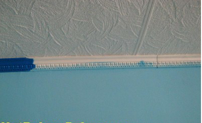 Расскажу как я красил потолочный плинтус. Делали ремонт в детской комнате. Раньше были обои на стенах, решили ободрать и покрасить стены водоэмульсионкой. Естественно, сначала отшпаклевав стены. Причем очень аккуратно, т.к. обои смогут скрыть дефекты стены. А вот после покраски все трещины и неровности видны. Хотя не об этом сейчас рассказ. Так вот, при покраске стены краской обляпываются плинтуса потолочные, которые мы решили вместе с потолочной плиткой оставить от старого ремонта. И вот чтобы эти огрехи скрыть, да и для более приятного внешнего вида комнаты, решено было покрасить плинтуса. Для покраски плинтусов использовали остатки краски от покраски стен. Только добавили туда еще темно-синего колера. Стена получилась голубенькая, а плинтус для контрастности решено было сделать потемней. Итак, имеем вот такой плинтус, белый, но заляпанный снизу краской: Красим потолочной плинтус - перед покраской Сначала приклеиваем ровненько и аккуратно малярный скотч на стену прямо под плинтус: