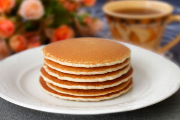 ► 1,5 чашки пшеничной муки ► 3,5 чайной ложки разрыхлителя ► 1 чайная ложка соли ► 1 столовая ложка сахара ► 1 1/4 стакана муки ► 1 яйцо ► 3 столовых ложки расплавленного сливочного масла В большой миске просейте вместе муку, разрыхлитель, соль и сахар. Сделайте колодец в центре и влейте молоко, яйцо и растопленное масло; перемешайте до однородности. Нагрейте слегка смазанную маслом сковородку на среднем огне. Налейте замешанное тесто на сковородку, используя приблизительно 1/4 чашки для каждого