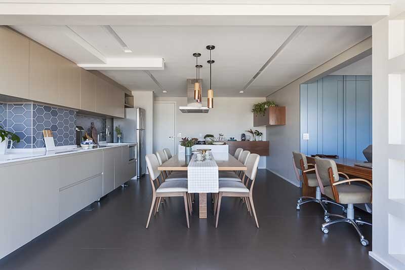 Квартира площадью 84 кв. м находится в одном из домов Сан-Паулу, Бразилия. Её хозяева – молодая пара – поставили перед дизайнерами задачу: пространство должно быть максимально функциональным и учитывать потребности их повседневной жизни, а также предусматривать зону для приёма гостей. Основатели TRIA Arquitetura – Сара Бонанно и Марина Кардосо де Альмейда – предложили следующую функциональную программу апартаментов: кухню, интегрированную со столовой и гостиной, зону обслуживания, объединённую с балконом, ванную комнату, гостевую спальню и спальню хозяев. Кухню, зону обслуживания и комнаты визуально объединяет гомогенный пол, покрытый крупной керамической плиткой тёмно-серого цвета. Выбор был обусловлен, прежде всего, практичностью. В более приватных зонах, как, например, спальне, – деревянный пол. Он делает комнату более комфортной и уютной. Один из характерных элементов интерьера – панели холодного голубого цвета, которые скрывают спальню, гостевую и ванную комнату. Отсутствие дв
