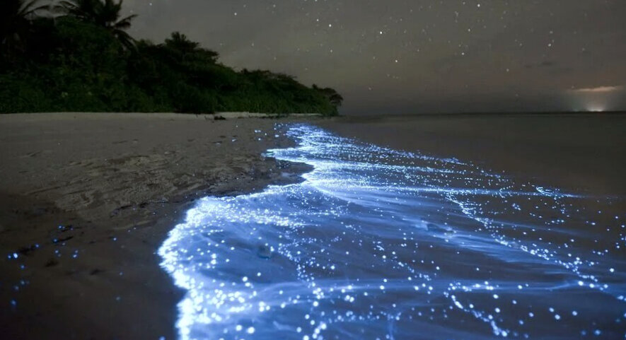 Когда мы слышим слово Мальдивы, у многих остров ассоциируется с тропиками, экзотикой и хорошим качественным отдыхом. И это правда! Но кроме вышеперечисленных достоинств на полуострове Ваадху, принадлежащему мальдивскому архипелагу, существует пляж невероятной красоты, в ночное время напоминающий космос. Как оказывается, это природное явление вызвано биолюминисценцией, или другими словами, способностью живых организмов светиться. Вот поэтому с приходом ночи белые пляжи Ваадху превращаются в идеальное место для романтических свиданий. Его сверкание завораживает, вдохновляет и восхищает. Потрясающее зрелище светящей воды похоже на сказку с элементами колдовства, которое лучше всего наблюдать с июля по февраль. Кстати, купаться в водах Индийского океана в момент свечения не особо рекомендуют. Во-первых - волны, а во-вторых - дискомфорт, но насладится уникальным явлением просто необходимо. Когда ты смотришь на это великолепие, кажется, что голубые светящиеся волны словно отражают звёзд