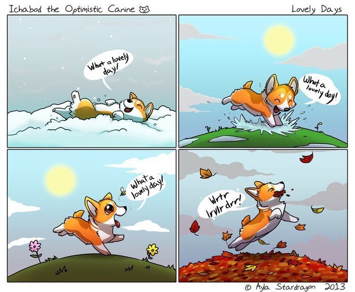 Однажды я увидела картинку вот с таким милым песиком От нее на душе стало как-то очень тепло и немного стыдно одновременно. Тепло – потому что песя очень милый, толстенький и счастливый. Стыдно – потому что, как и многие люди, иногда слишком сильно брюзжу, на погоду в том числе. А песя нет. Песя находит радость в каждом времени года и выглядит очень счастливым. С тех пор я задумалась, и в принципе научилась так же находить что-то приятное в каждом сменяющем друг друга сезоне. Ладно, почти каждом. Зиму я так и не полюбила.