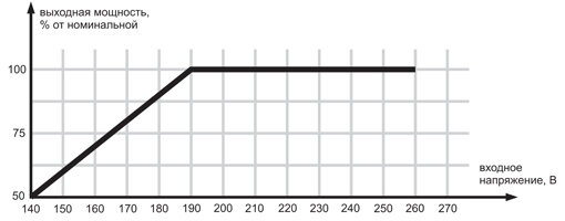 Еще не маловажный фактор - график зависимости выдаваемой мощности стабилизатора при текущем входном напряжении! У не дорогих релейных и электромеханических стабилизаторов этот график выглядит так: