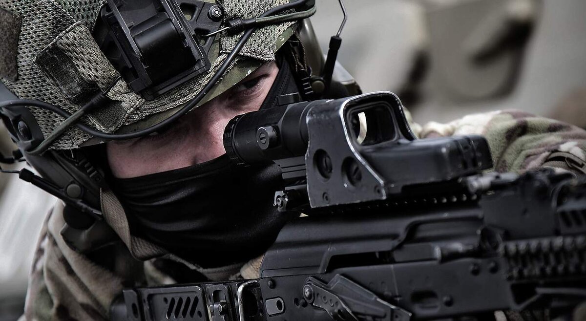 Основное огнестрельное оружие спецназовца обычно сильно отличается внешне от стандартного автомата мотострелка. Тут тебе и планки для установки дополнительного оборудования (ЛЦУ, фонарь, подствольный гранатомёт, сошки, передние рукоятки…), и специальный глушитель, и навороченный прицел (оптический, голографический, коллиматорный…), и складной приклад.