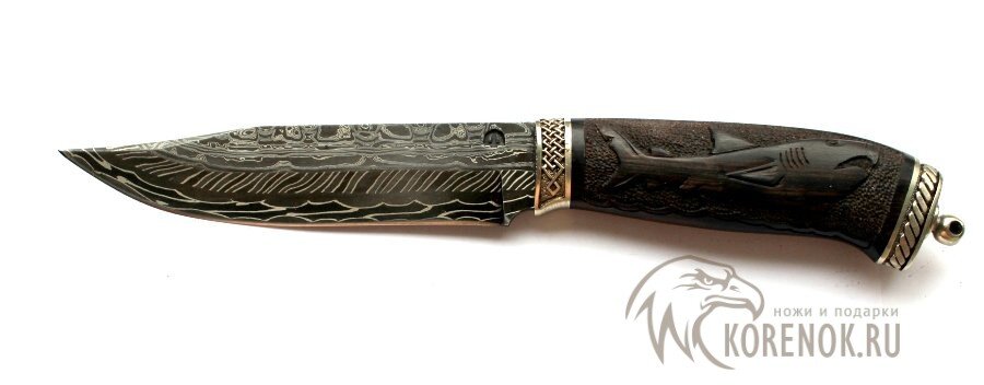 Обзор ножа "Финский-2" (торцевой дамаск с добавлением никеля, резной) в3 Клинок ножа классической формы изготовлен в мастерской Федотова (кузнец Соколов). Сам клинок из дамасской стали с добавлением никеля имеет сложный рисунок что подчеркивает мастерство кузнеца. Смотриться очень достойно и красиво. Никель придает клинку контрастный цвет. Если обычный дамаск имеет цвет серый и темно серый, то тут клинок очень темный с прожилками белого (немного золотистого) цвета. Дамаск составной. Обух клинка сделан из дамасской стали, низ клинка из инструментальной стали А8 с вставками из никеля. Длина клинка 152 мм, ширина 32 мм, толщина 4.4 мм. Рукоять ножа сделана из эбена и украшена изображением акулы, как символа бизнеса. Гарда и тыльник мельхиоровые. Эбе́новое де́рево, или Эбе́н, — чёрная (или чёрная с полосами) древесина некоторых тропических деревьев. Ядровая древесина без различимых годовых колец очень твёрдая и тяжёлая и относится к самым ценным древесным породам. Плотность эбена