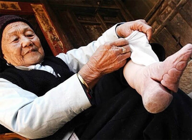 Когда девушка в Китае достигала возраста 4-5 лет, ей привязывали 4 пальца подгибали вниз к ступне и крепко привязывали...